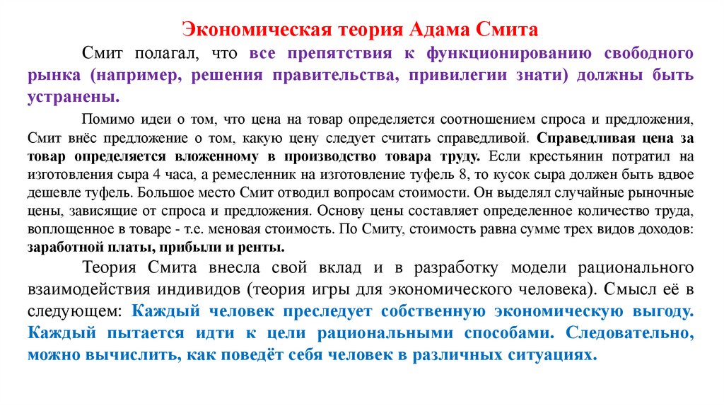 Экономическая теория Адама СмитаСмит полагал, что все препятствия к функционированию свободного