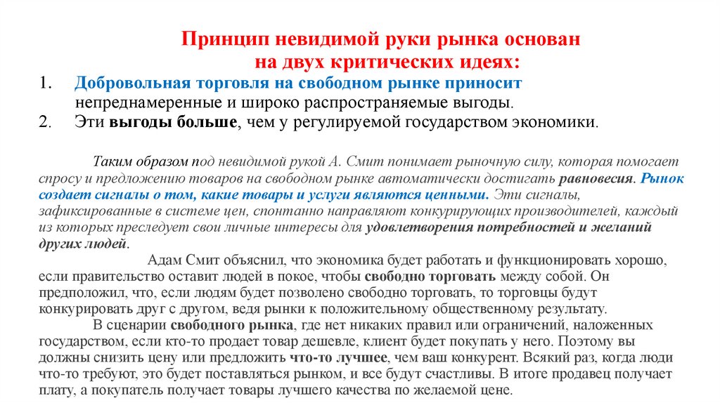 Принцип невидимой руки рынка основанна двух критических идеях: