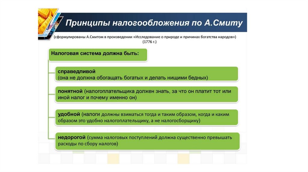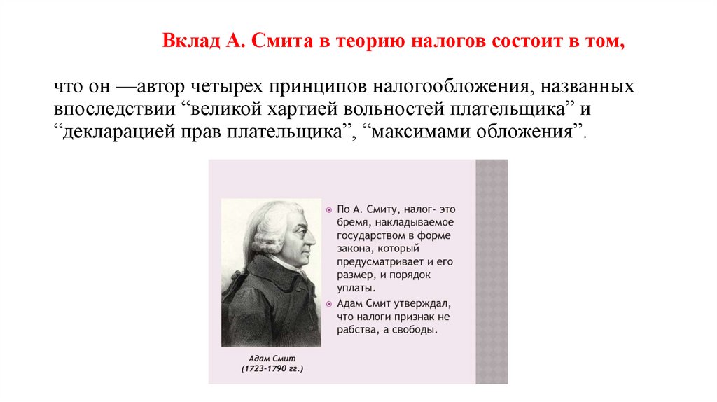 Вклад А. Смита в теорию налогов состоит в том,что он —автор четырех принципов налогообложения, названных