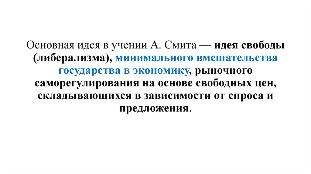 Основная идея в учении А. Смита — идея свободы(либерализма), минимального вмешательства