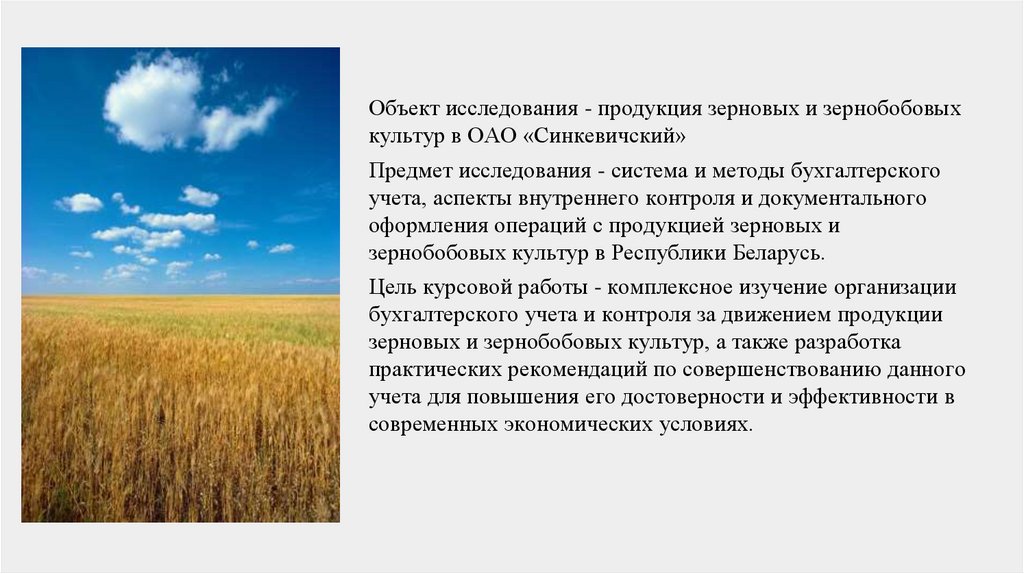 Объект исследования - продукция зерновых и зернобобовыхкультур в ОАО «Синкевичский»