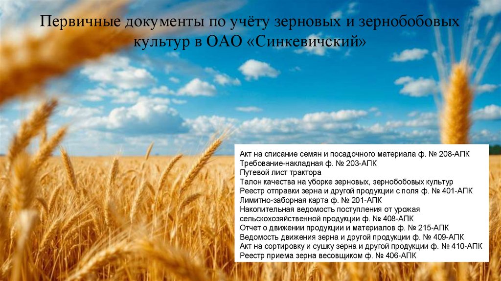 Первичные документы по учёту зерновых и зернобобовыхкультур в ОАО «Синкевичский»