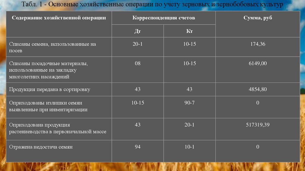 Табл. 1 - Основные хозяйственные операции по учету зерновых и зернобобовых культурСодержание хозяйственной операции