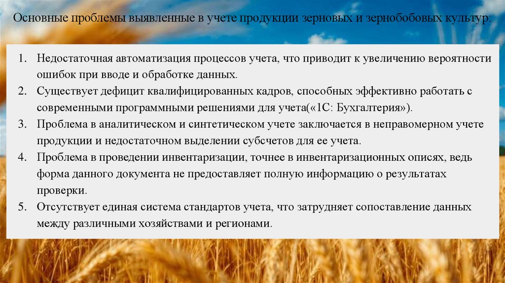 Основные проблемы выявленные в учете продукции зерновых и зернобобовых культур:1. Недостаточная автоматизация процессов учета, что приводит к увеличению вероятности