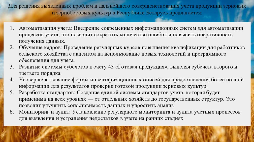 Для решения выявленных проблем и дальнейшего совершенствования учета продукции зерновыхи зернобобовых культур в Республике Беларусь предлагается: