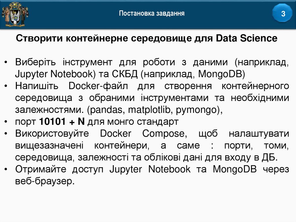 Jupyter Notebook) та СКБД (наприклад, MongoDB)