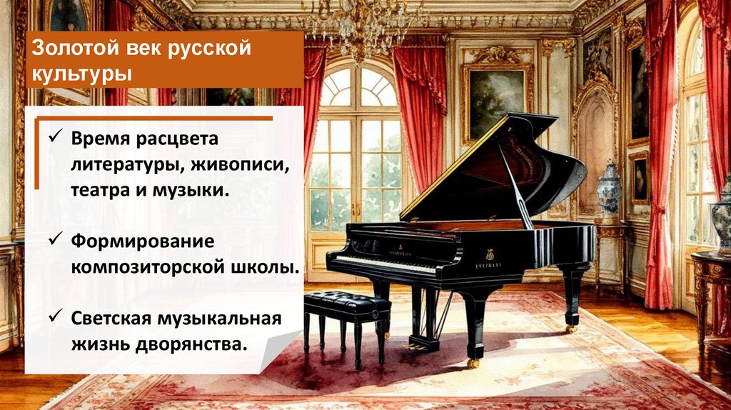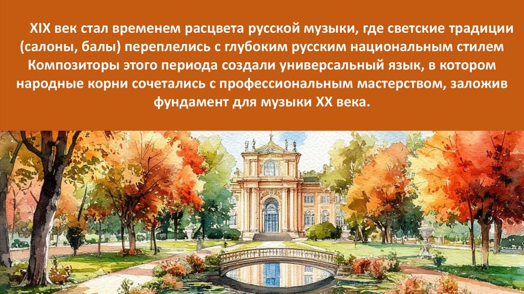 XIX век стал временем расцвета русской музыки, где светские традиции(салоны, балы) переплелись с глубоким русским национальным стилем