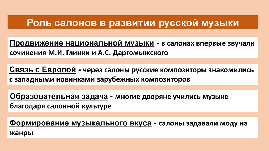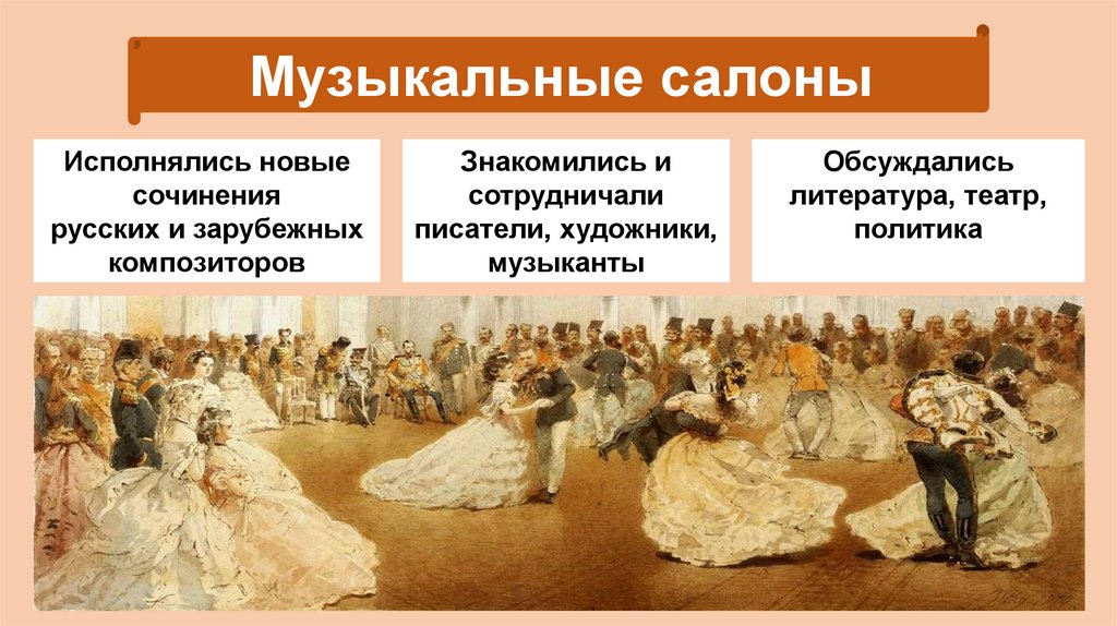 Роль салонов в развитии русской музыкиПродвижение национальной музыки - в салонах впервые звучали