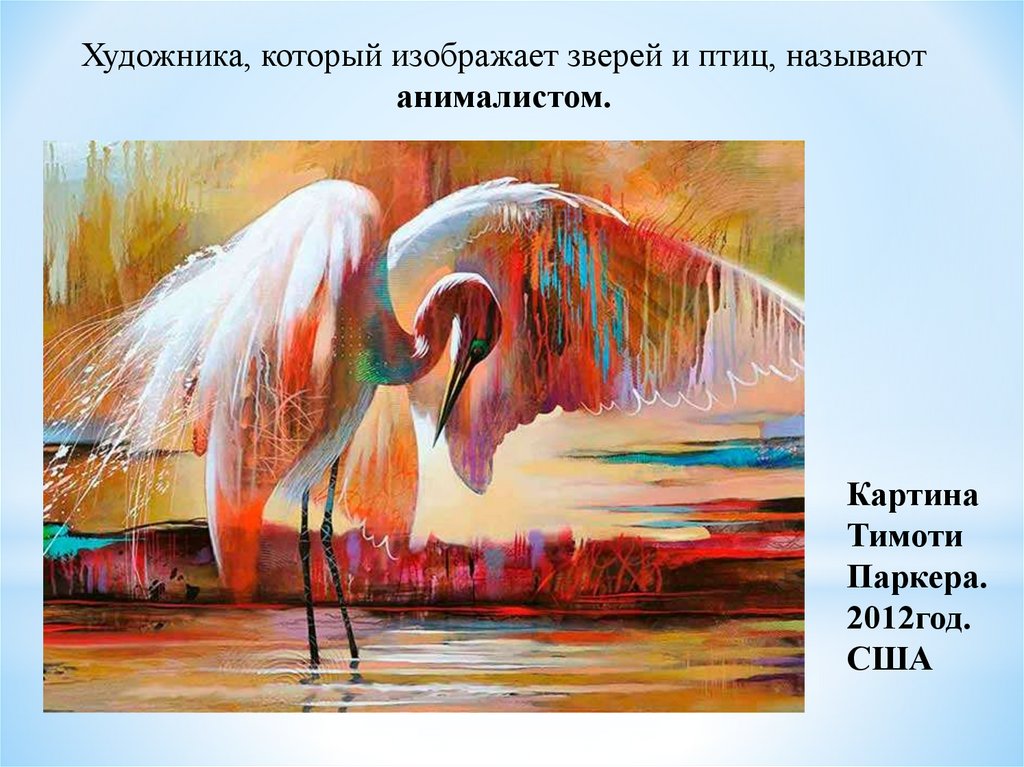 Художника, который изображает зверей и птиц, называютанималистом.