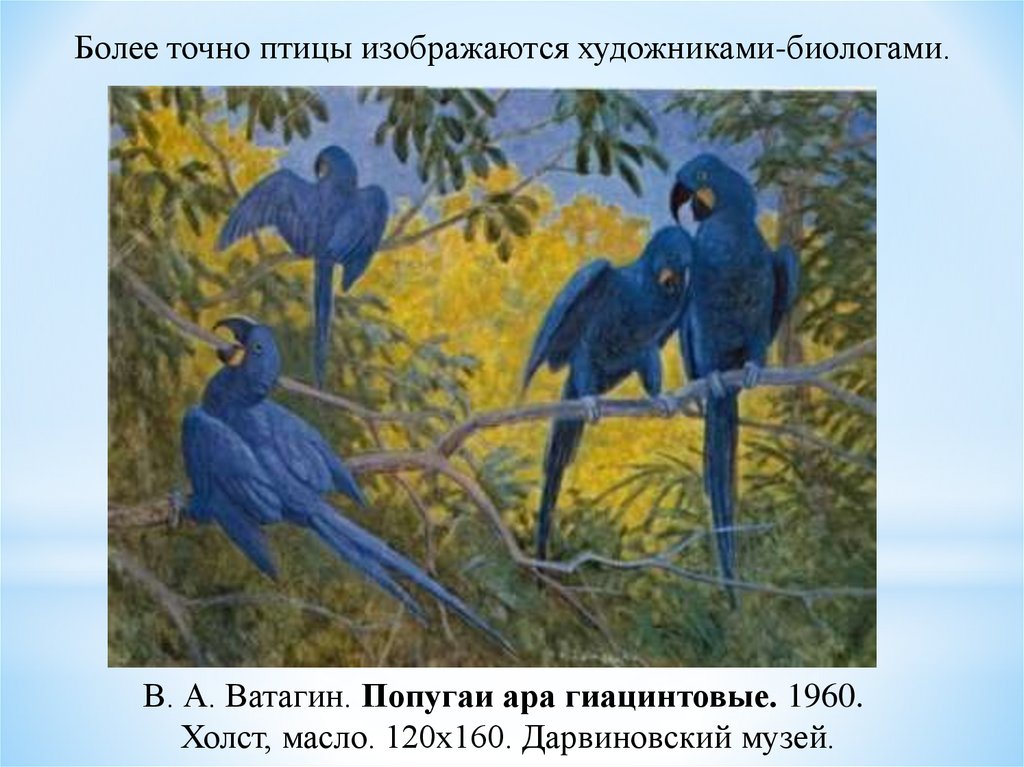 Более точно птицы изображаются художниками-биологами.В. А. Ватагин. Попугаи ара гиацинтовые. 1960.
