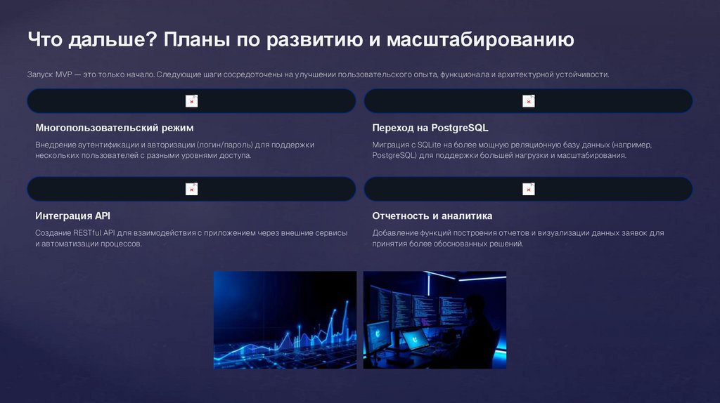 Что дальше? Планы по развитию и масштабированиюЗапуск MVP — это только начало. Следующие шаги сосредоточены на улучшении пользовательского опыта, функционала и архитектурной устойчивости.