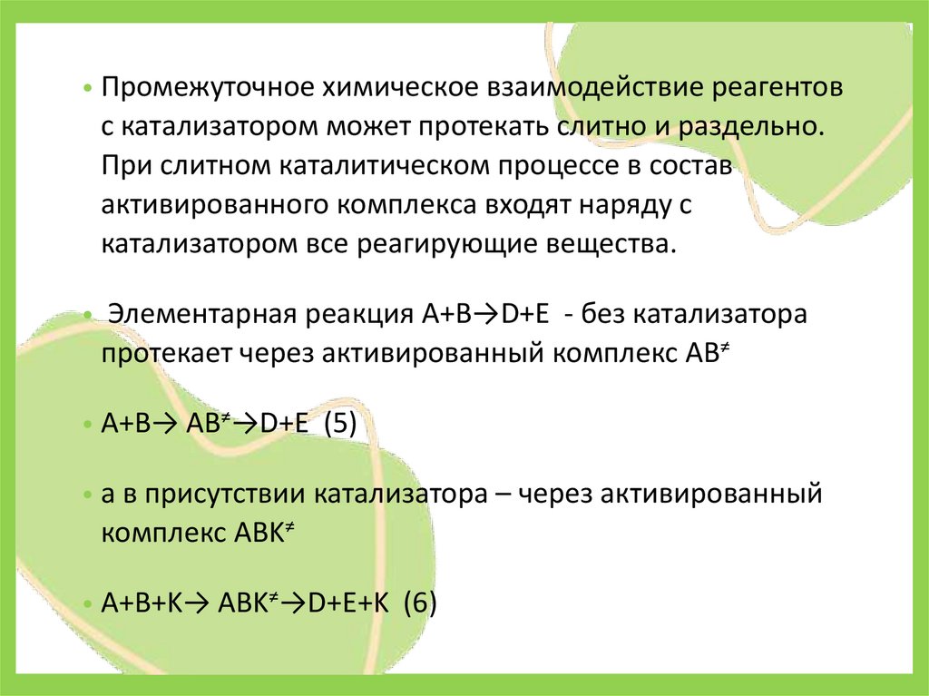 • Промежуточное химическое взаимодействие реагентовс катализатором может протекать слитно и раздельно.