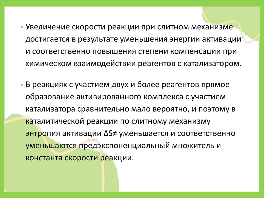 • Увеличение скорости реакции при слитном механизмедостигается в результате уменьшения энергии активации