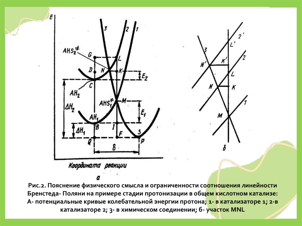 Рис.2. Пояснение физического смысла и ограниченности соотношения линейностиБренстеда- Поляни на примере стадии протонизации в общем кислотном катализе: