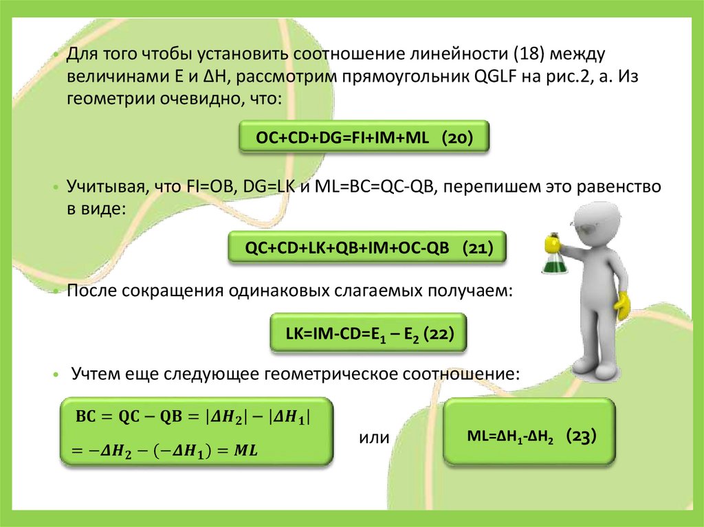 • Для того чтобы установить соотношение линейности (18) междувеличинами Е и ΔН, рассмотрим прямоугольник QGLF на рис.2, а. Из