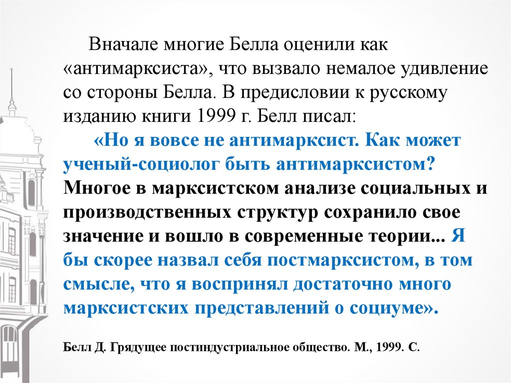 Белл Д. Грядущее постиндустриальное общество. М., 1999. С.
