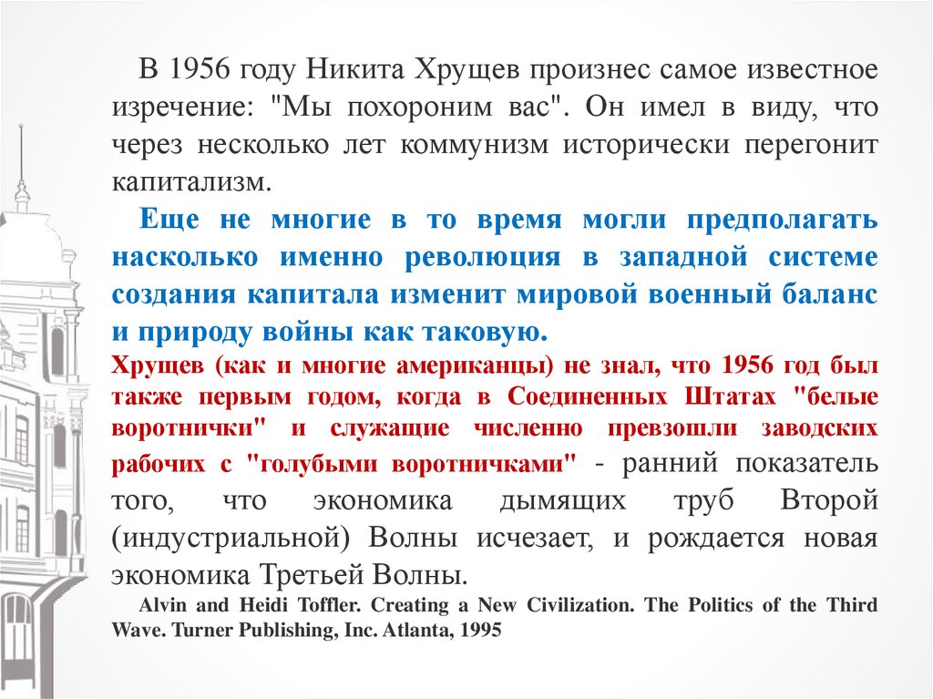 Alvin and Heidi Toffler. Creating a New Civilization. The Politics of the Third