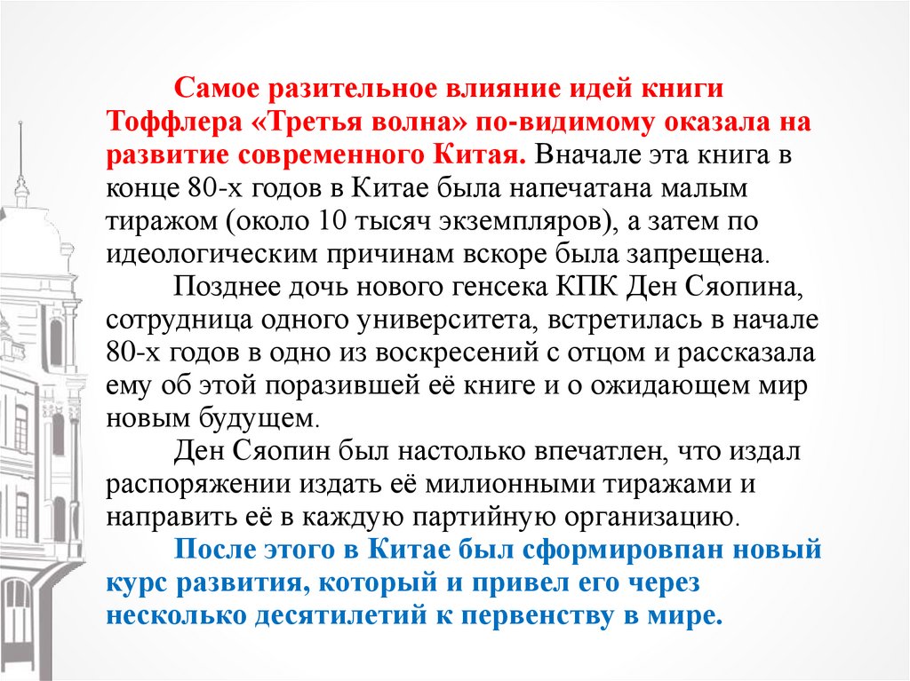 Самое разительное влияние идей книгиТоффлера «Третья волна» по-видимому оказала на
