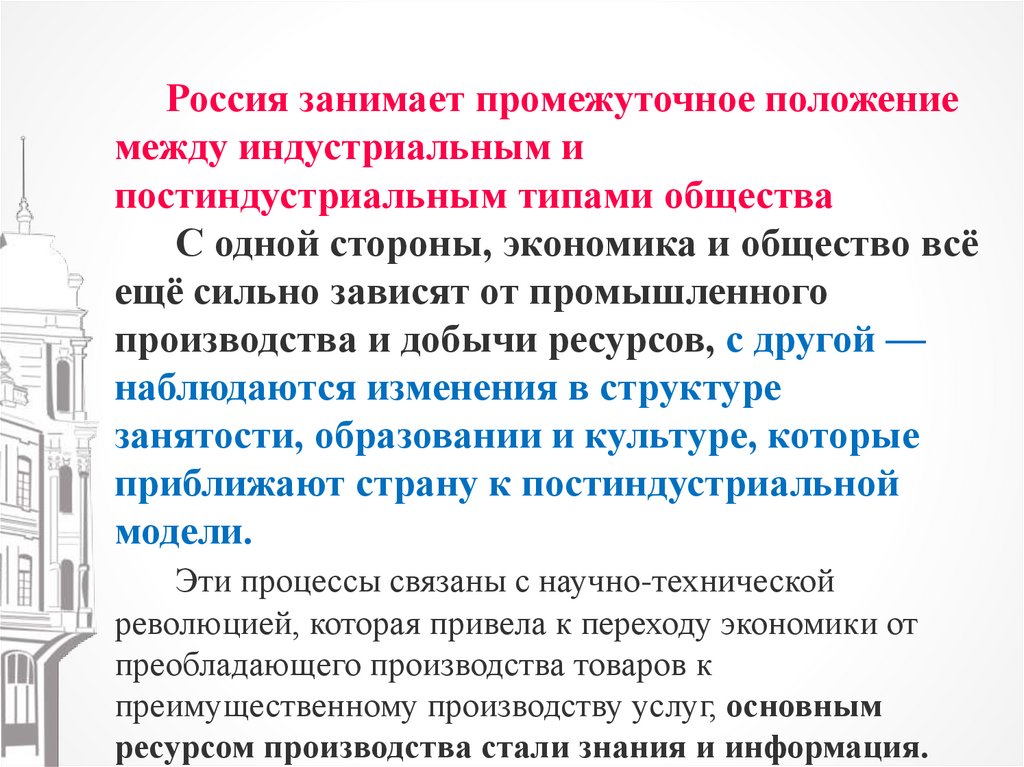 Россия занимает промежуточное положениемежду индустриальным и