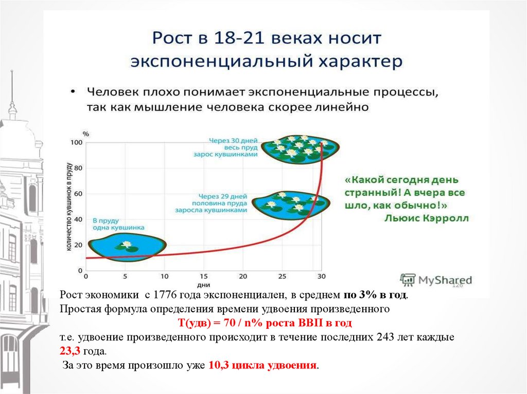 Рост экономики с 1776 года экспоненциален, в среднем по 3% в год.Простая формула определения времени удвоения произведенного