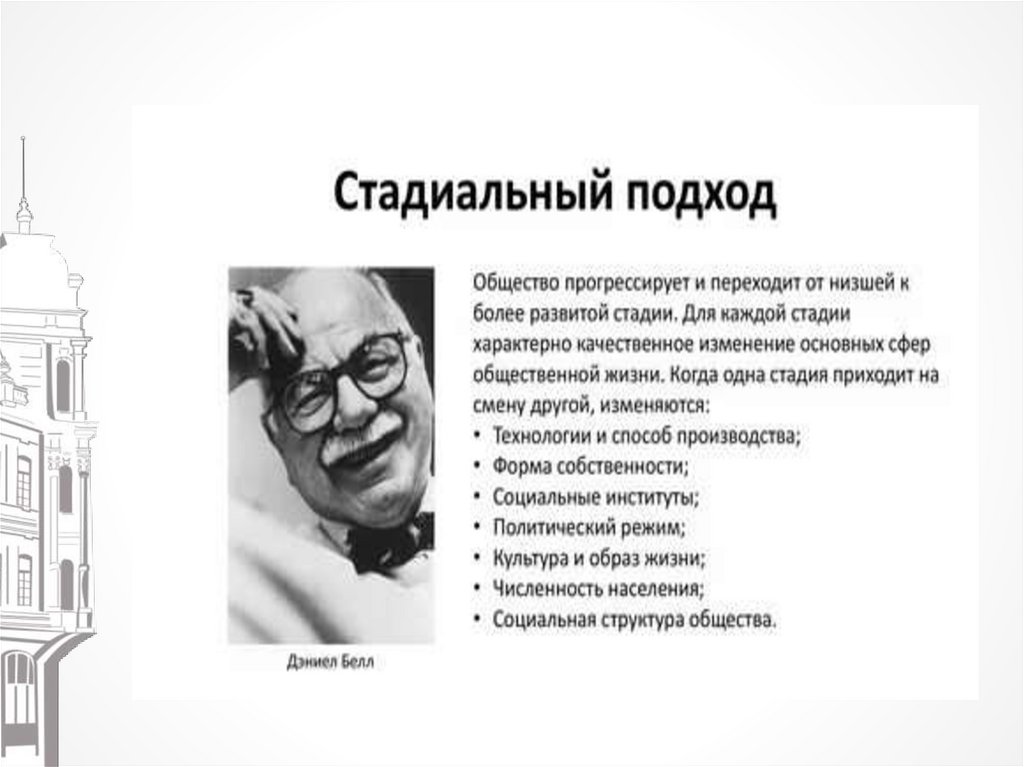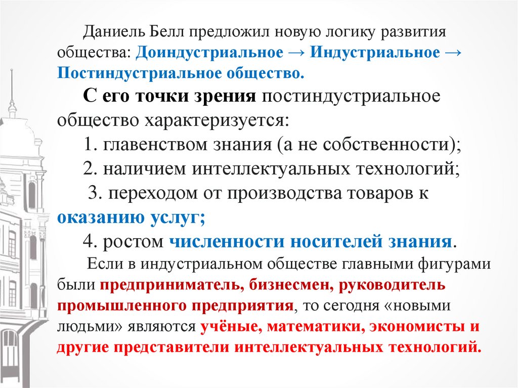 Даниель Белл предложил новую логику развитияобщества: Доиндустриальное → Индустриальное →
