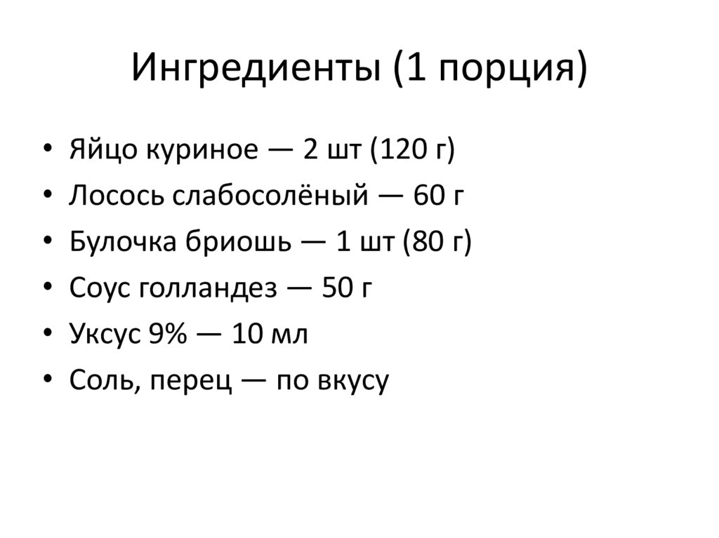 Ингредиенты (1 порция)• Яйцо куриное — 2 шт (120 г)