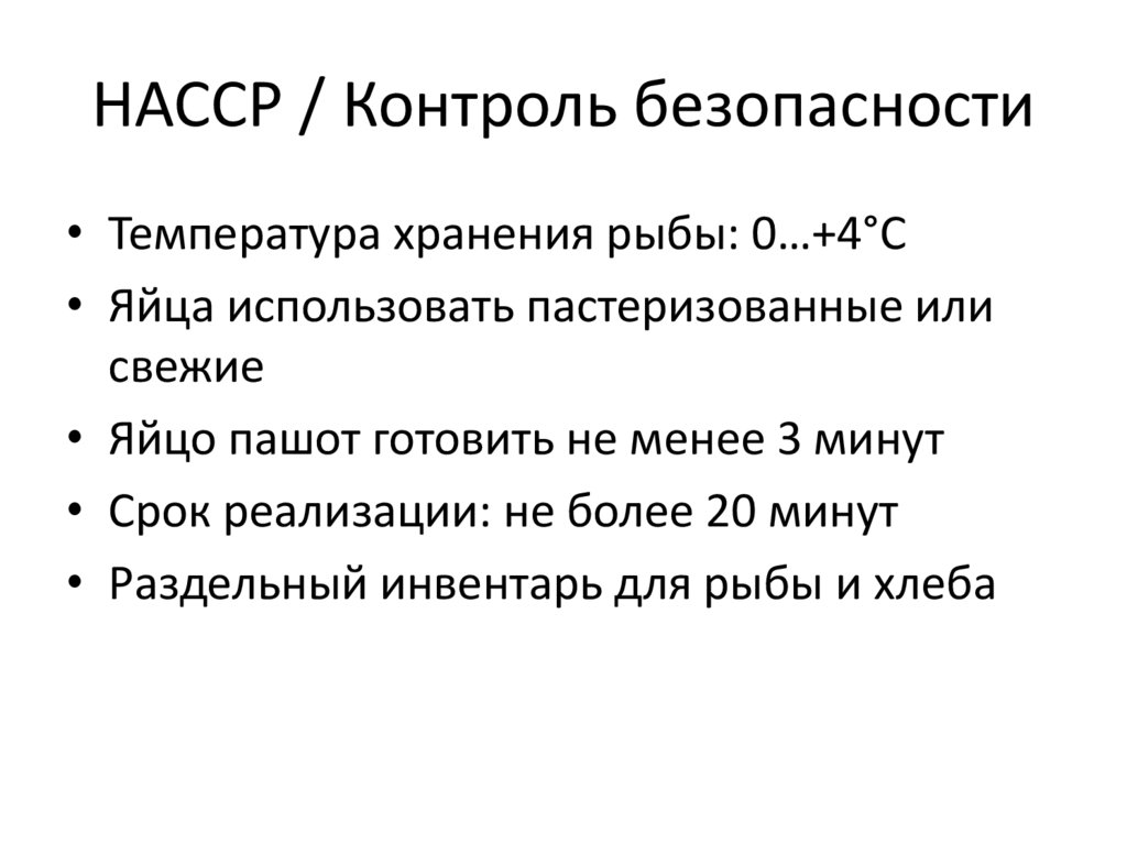 HACCP / Контроль безопасности• Температура хранения рыбы: 0…+4°C