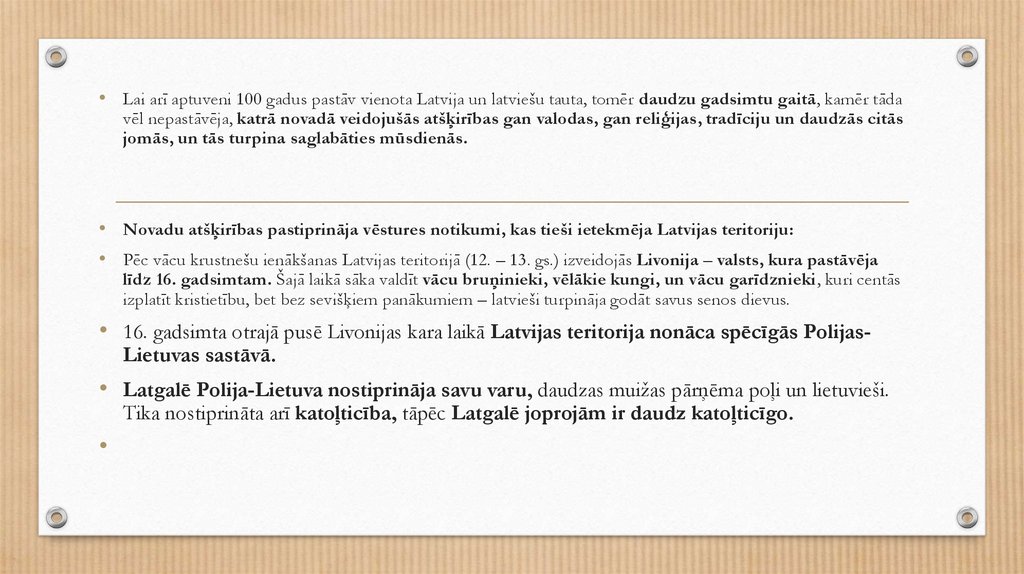 • Lai arī aptuveni 100 gadus pastāv vienota Latvija un latviešu tauta, tomēr daudzu gadsimtu gaitā, kamēr tādavēl nepastāvēja, katrā novadā veidojušās atšķirības gan valodas, gan reliģijas, tradīciju un daudzās citās