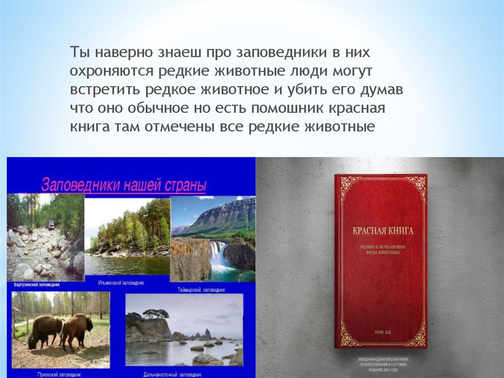 Ты наверно знаеш про заповедники в нихохроняются редкие животные люди могут