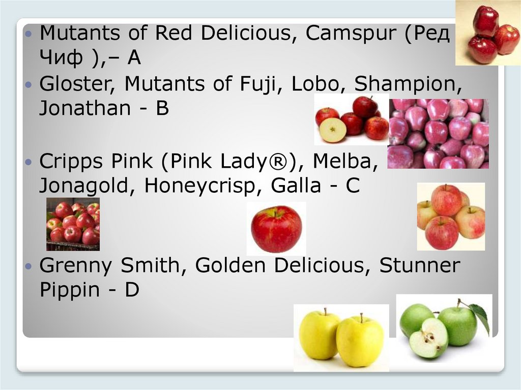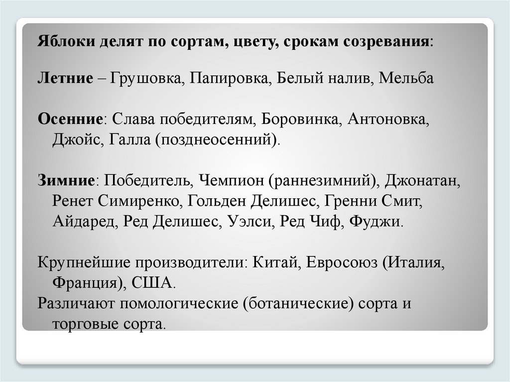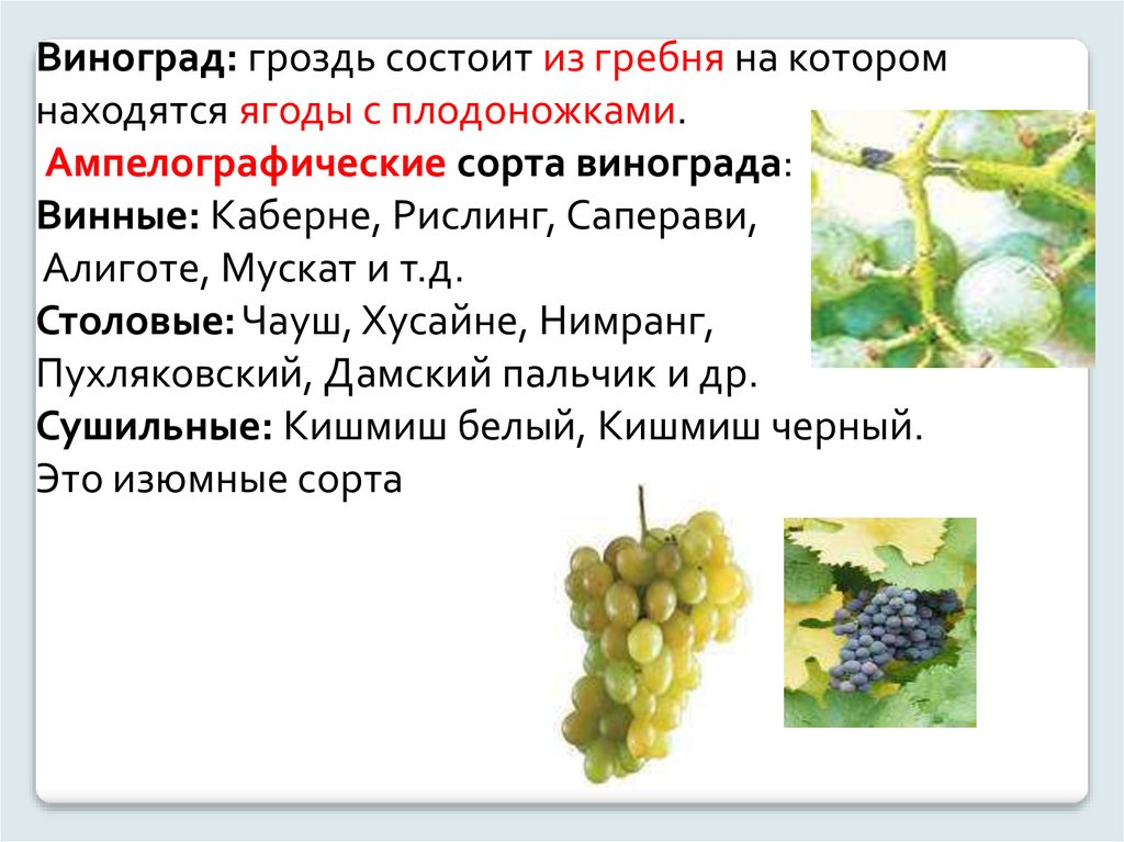 Все свежие плоды делятся на помологические сорта, виноград на ампелографические сорта.