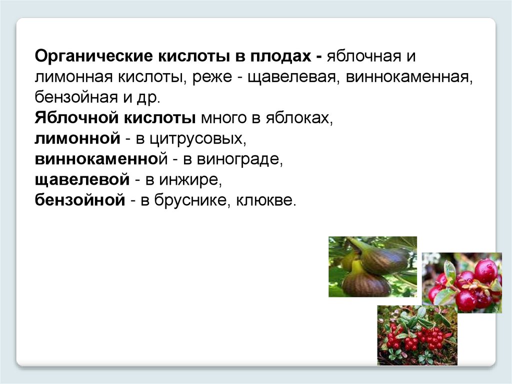 Органические кислоты в плодах - яблочная илимонная кислоты, реже - щавелевая, виннокаменная,