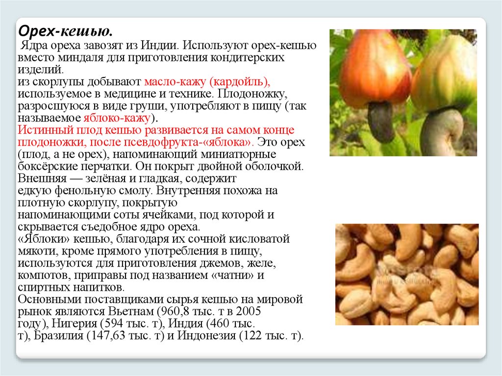 Орех-кешью.Ядра ореха завозят из Индии. Используют орех-кешью