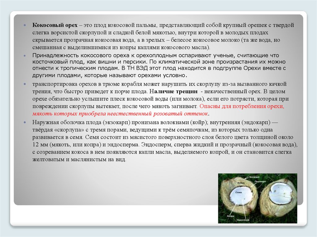 Кокосовый орех – это плод кокосовой пальмы, представляющий собой крупный орешек с твердойслегка ворсистой скорлупой и сладкой белой мякотью, внутри которой в молодых плодах