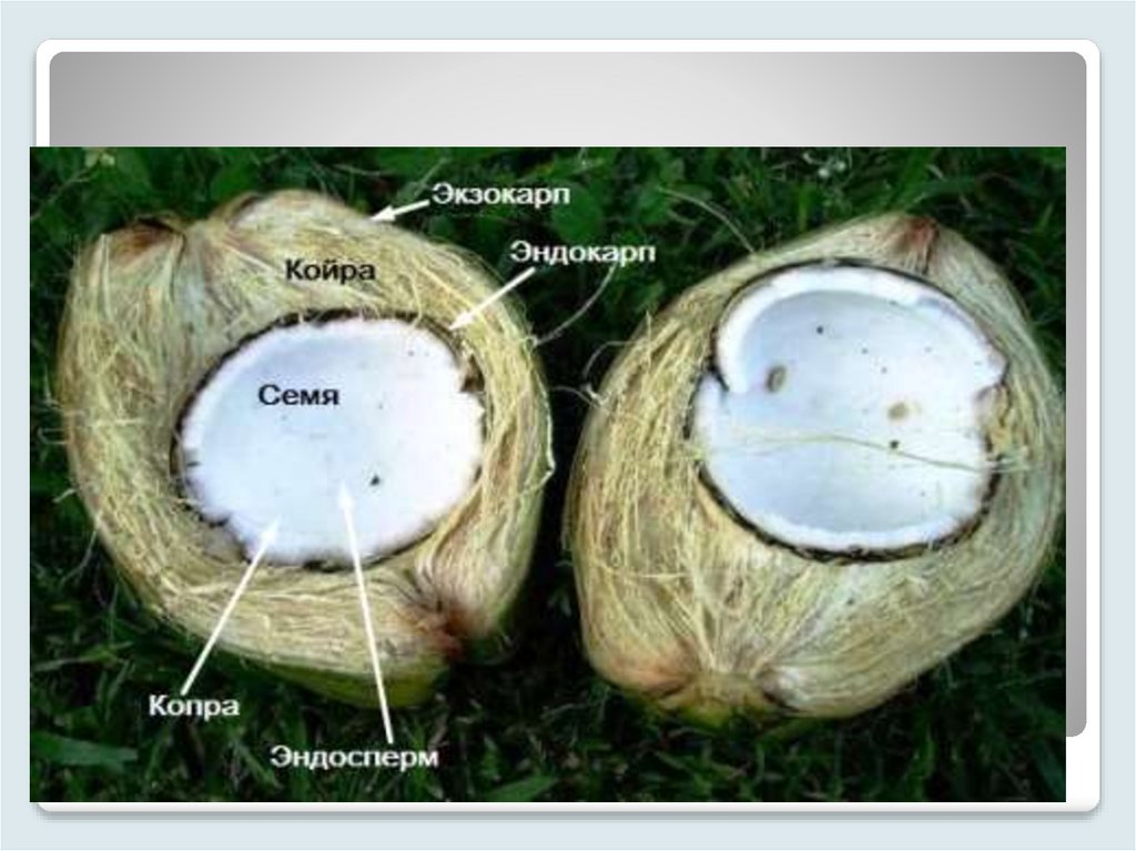 Наружная оболочка плода (экзокарп) пронизана волокнами (койр); внутренняя (эндокарп) —
