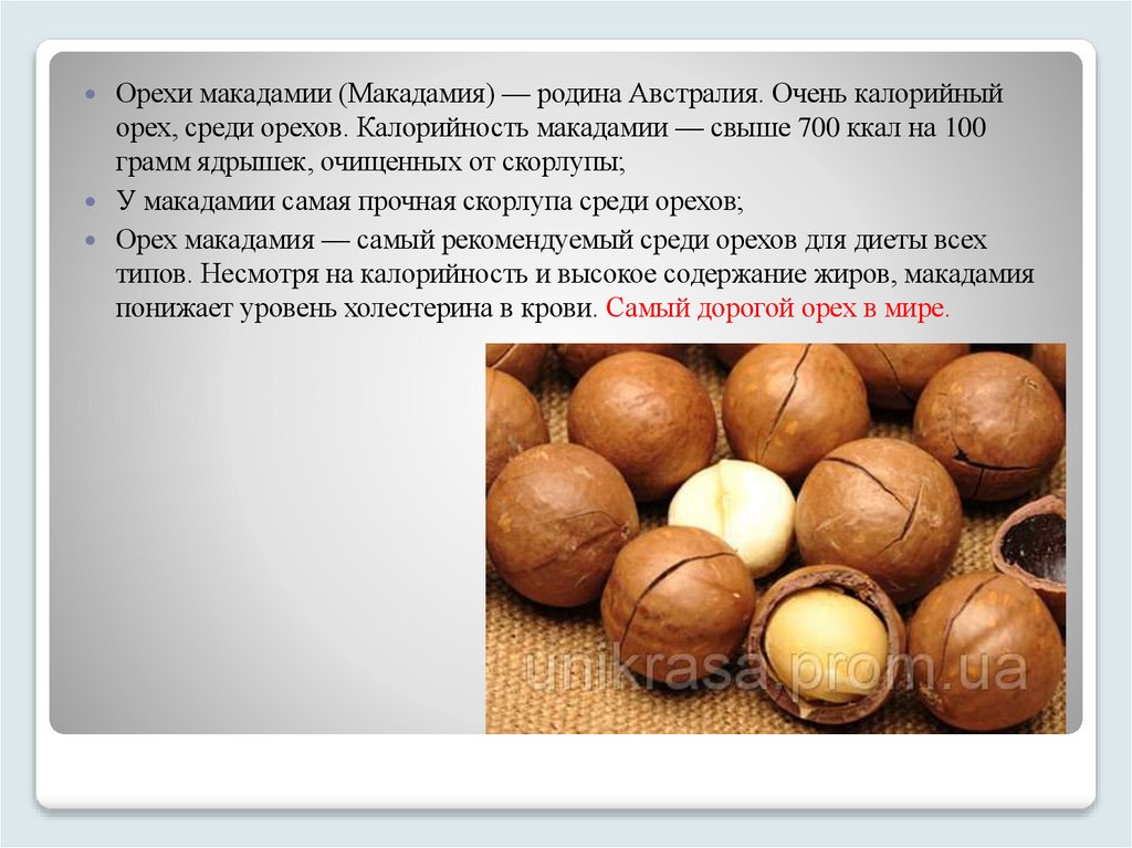 Орехи макадамии (Макадамия) — родина Австралия. Очень калорийныйорех, среди орехов. Калорийность макадамии — свыше 700 ккал на 100