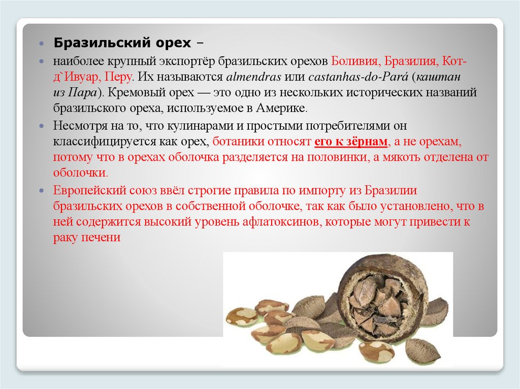 Бразильский орех –наиболее крупный экспортёр бразильских орехов Боливия, Бразилия, Котд`Ивуар, Перу. Их называются almendras или castanhas-do-Pará (каштан