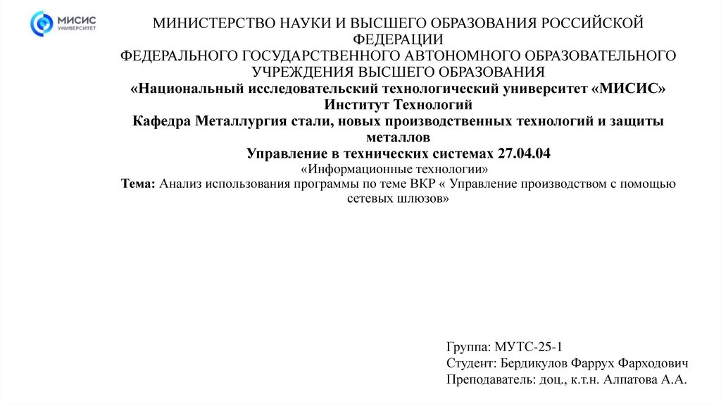 УЧРЕЖДЕНИЯ ВЫСШЕГО ОБРАЗОВАНИЯ«Национальный исследовательский технологический университет «МИСИС»