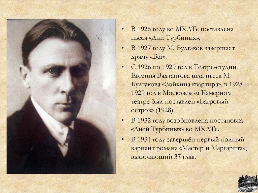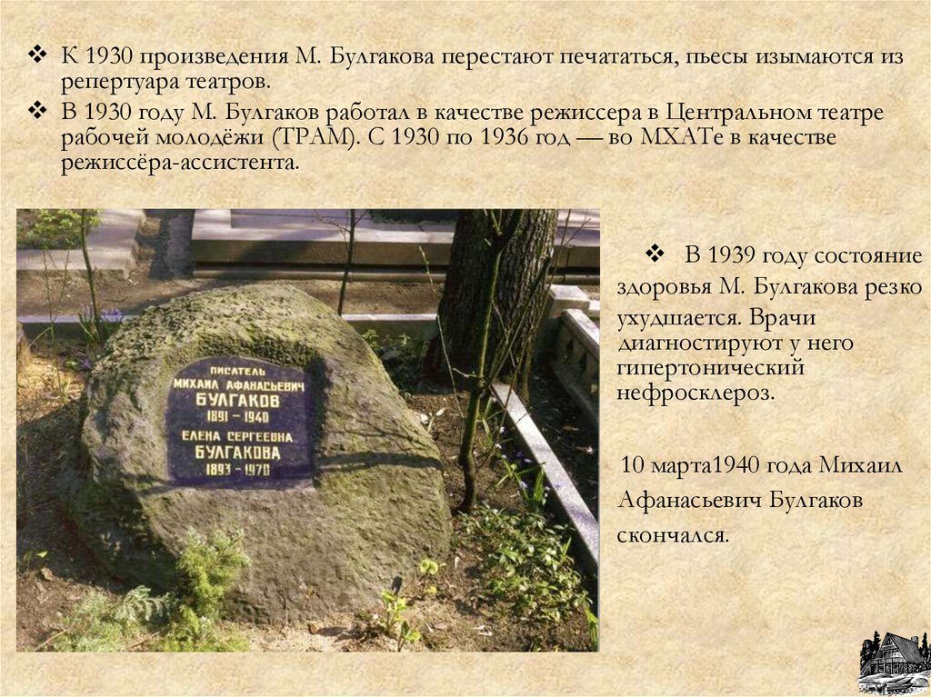 К 1930 произведения М. Булгакова перестают печататься, пьесы изымаются изрепертуара театров.