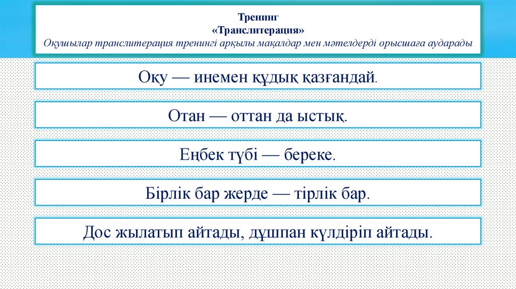 Оқушылар транслитерация тренингі арқылы мақалдар мен мәтелдерді орысшаға аударады