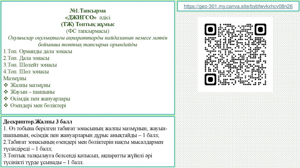 1. Өз тобына берілген табиғат зонасының жалпы мазмұнын, жауыншашынын, өсімдік пен жануарларын дұрыс анықтайды – 1 балл;