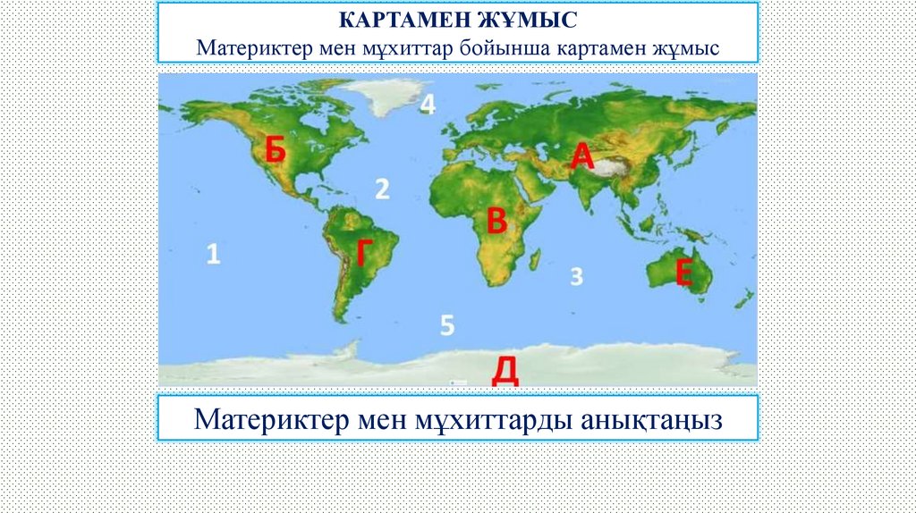 КАРТАМЕН ЖҰМЫСМатериктер мен мұхиттар бойынша картамен жұмыс