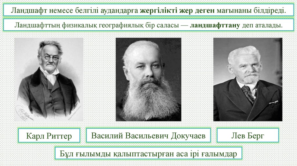 Ландшафт немесе белгілі аудандарға жергілікті жер деген мағынаны білдіреді.Ландшафттың физикалық географиялық бір саласы — ландшафттану деп аталады.