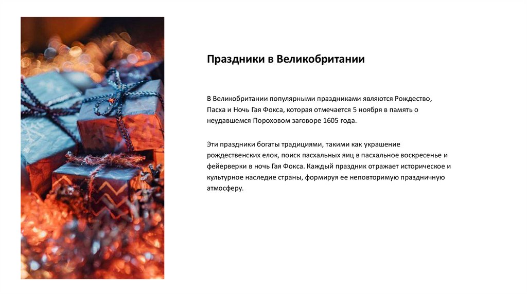 Праздники в ВеликобританииВ Великобритании популярными праздниками являются Рождество,