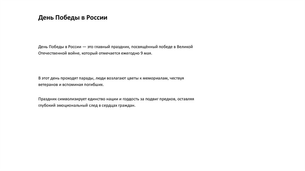 День Победы в РоссииДень Победы в России — это главный праздник, посвящённый победе в Великой