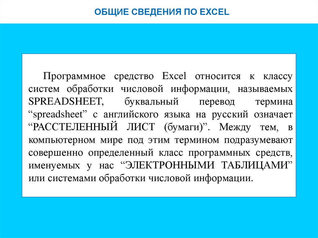 ОБЩИЕ СВЕДЕНИЯ ПО EXCELПрограммное средство Excel относится к классу