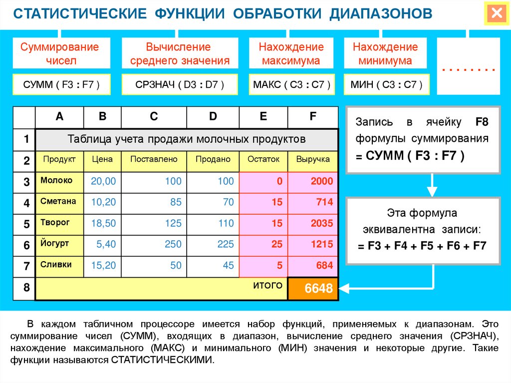 В каждом табличном процессоре имеется набор функций, применяемых к диапазонам. Это