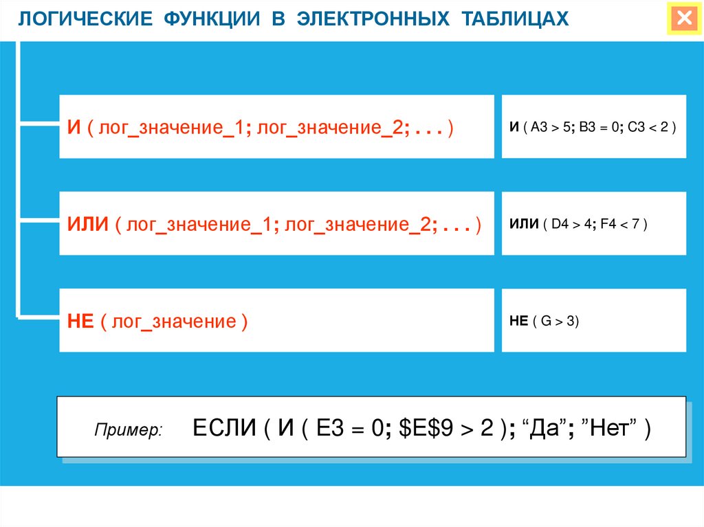 ЛОГИЧЕСКИЕ ФУНКЦИИ В ЭЛЕКТРОННЫХ ТАБЛИЦАХИ ( лог_значение_1; лог_значение_2; . . . )