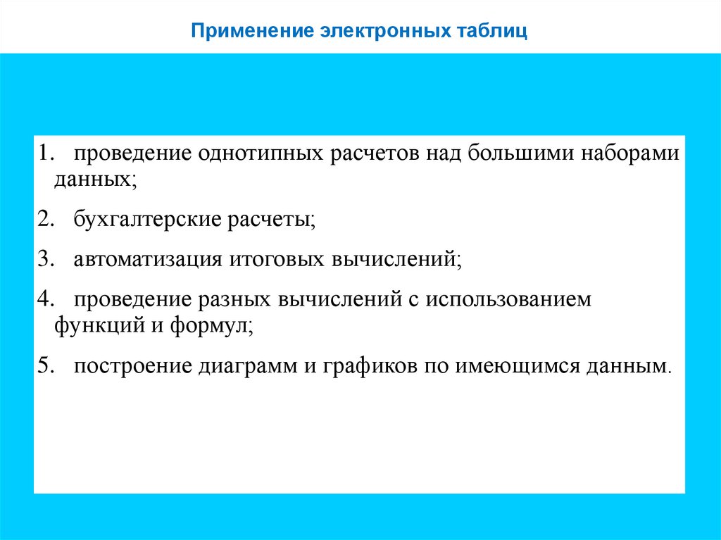 Применение электронных таблиц1. проведение однотипных расчетов над большими наборами