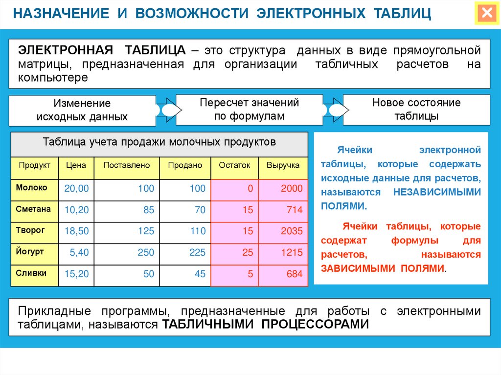 НАЗНАЧЕНИЕ И ВОЗМОЖНОСТИ ЭЛЕКТРОННЫХ ТАБЛИЦЭЛЕКТРОННАЯ ТАБЛИЦА – это структура данных в виде прямоугольной