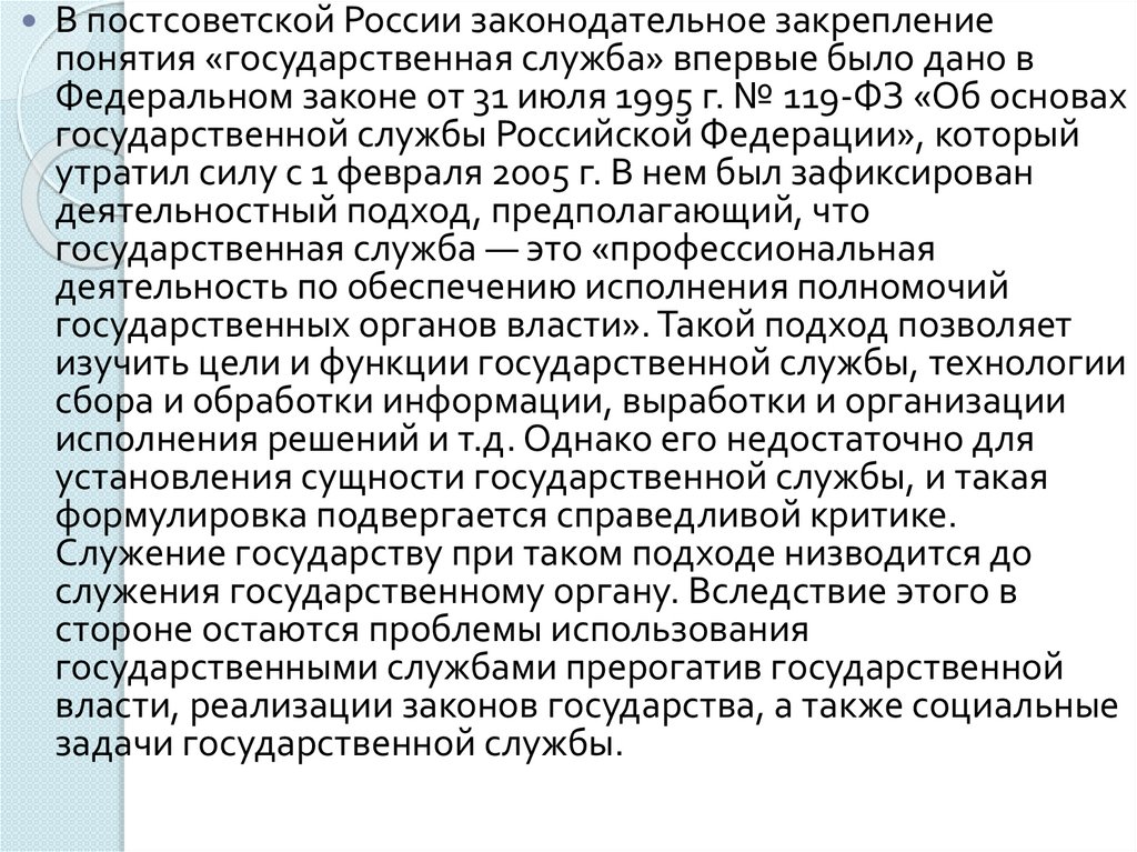 В постсоветской России законодательное закреплениепонятия «государственная служба» впервые было дано в